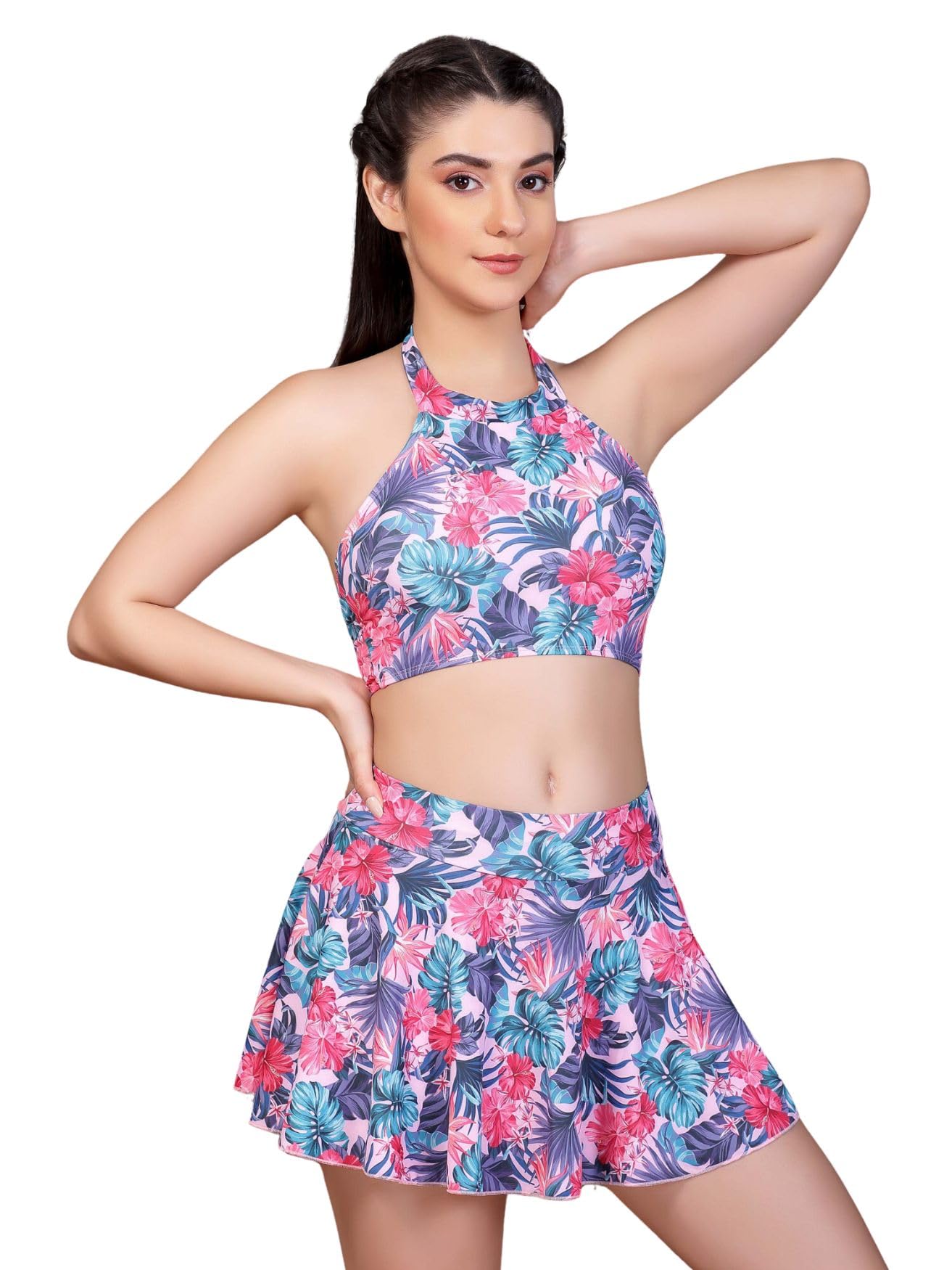 Trendy two-piece skirted swimwear with tropical blossom print.