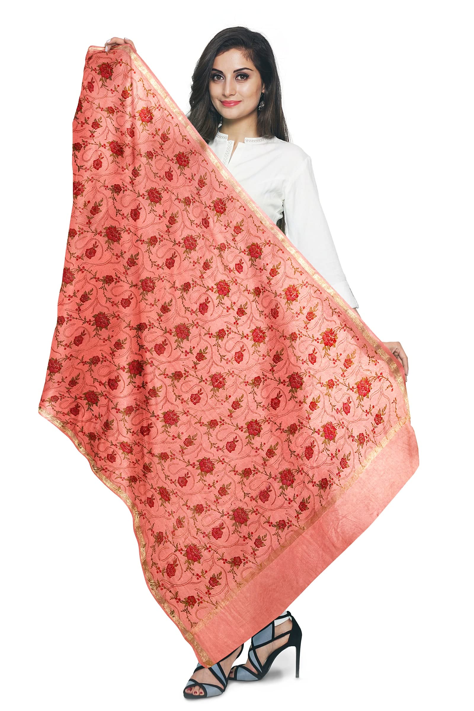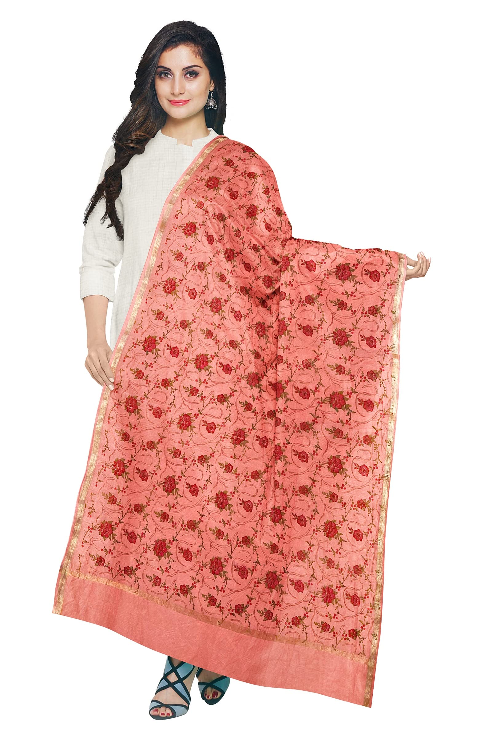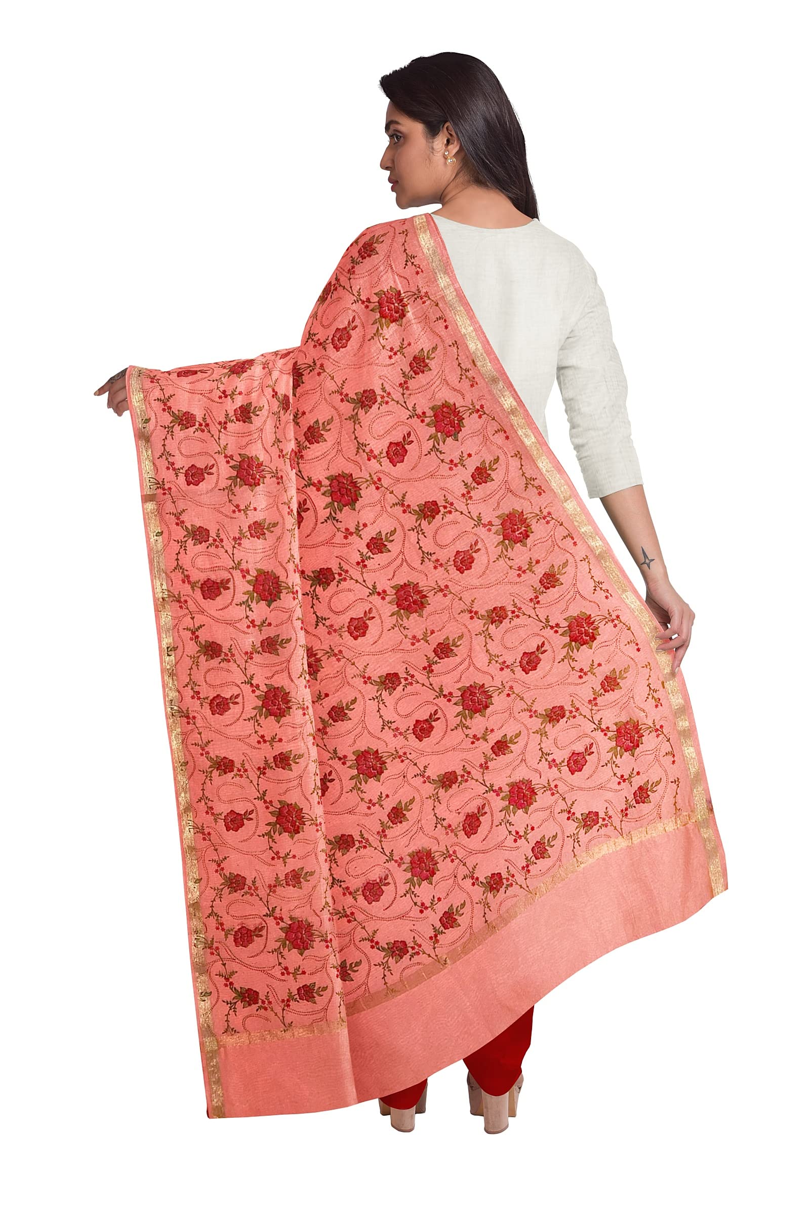 Banarasi cotton dupatta with handprinted floral design in peach and orange.