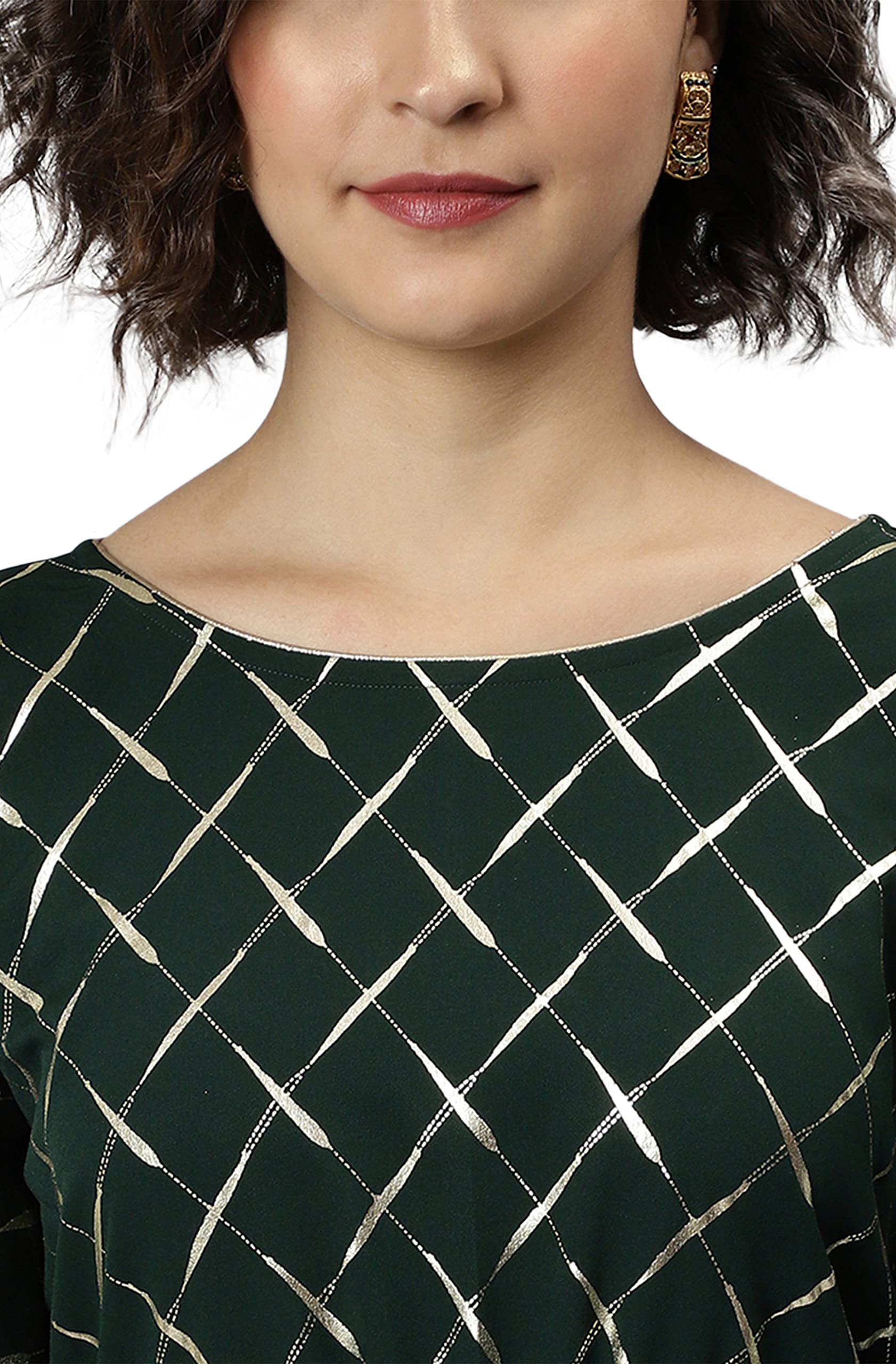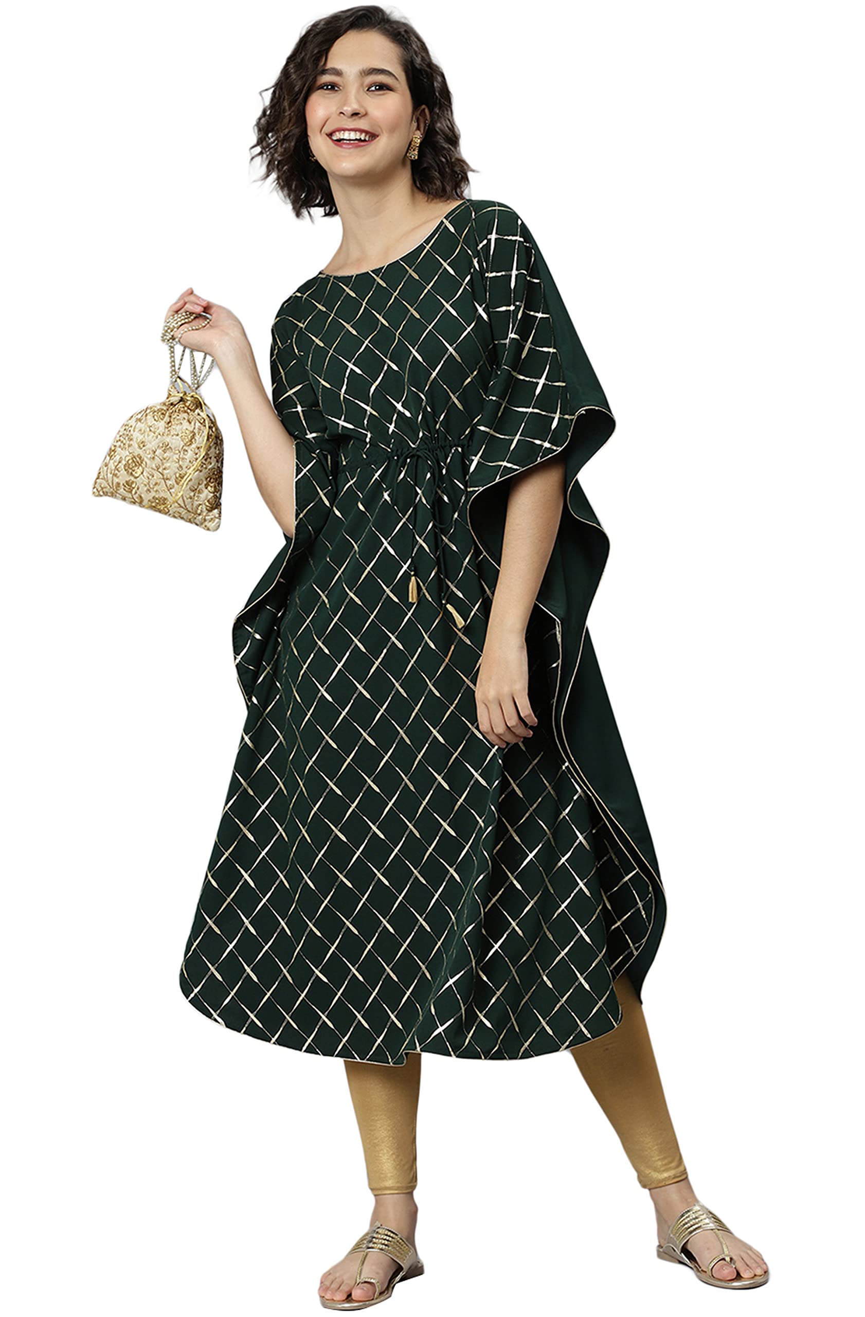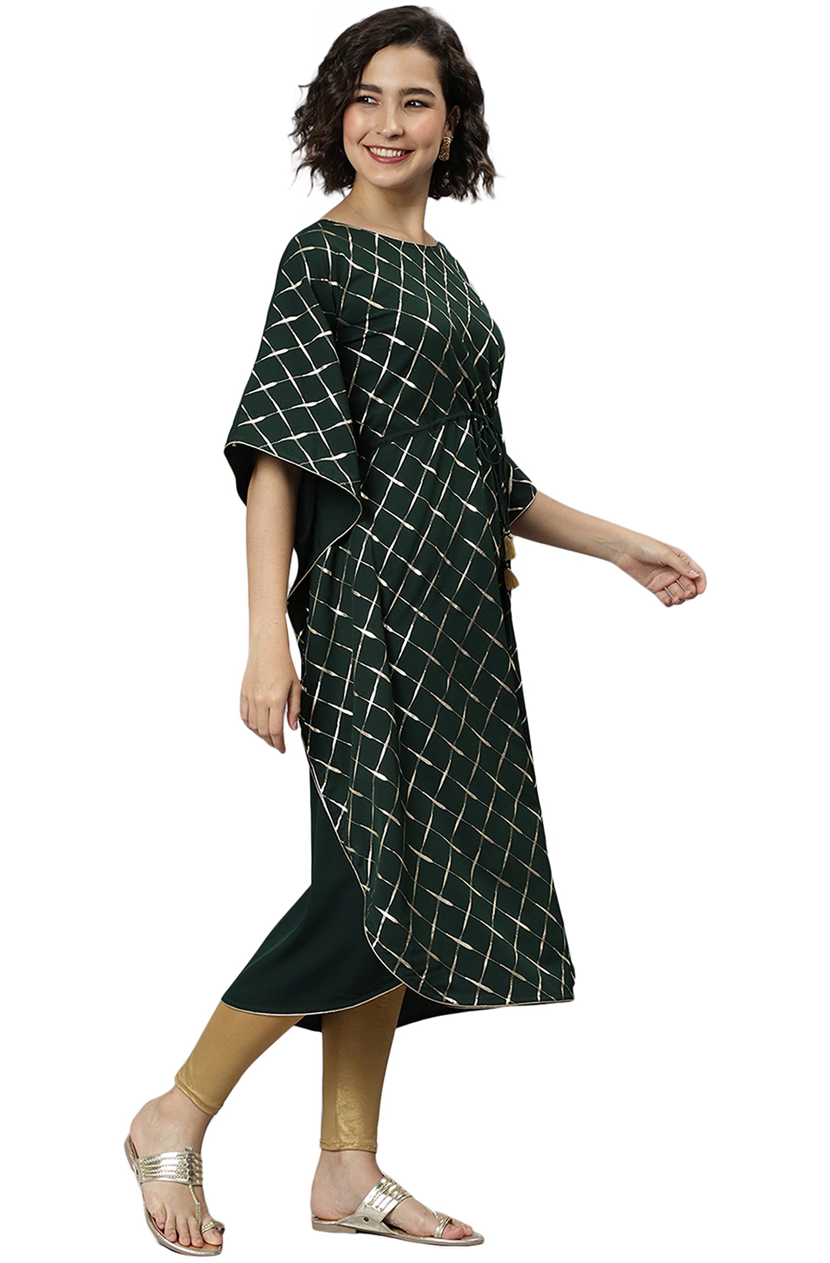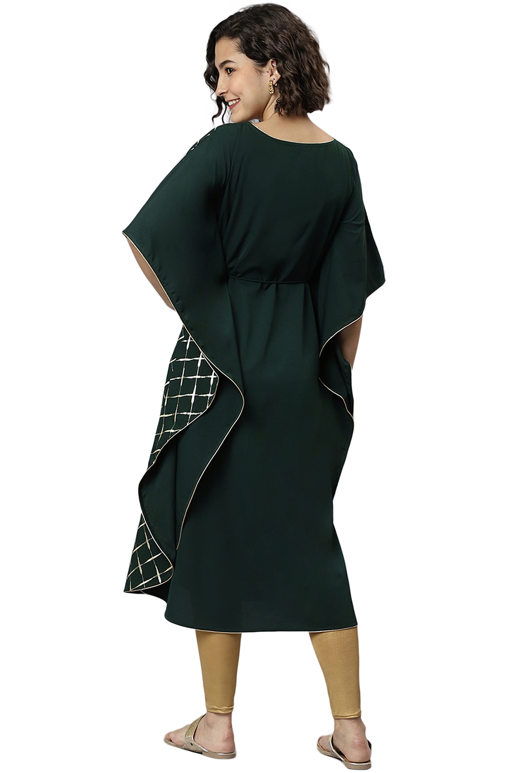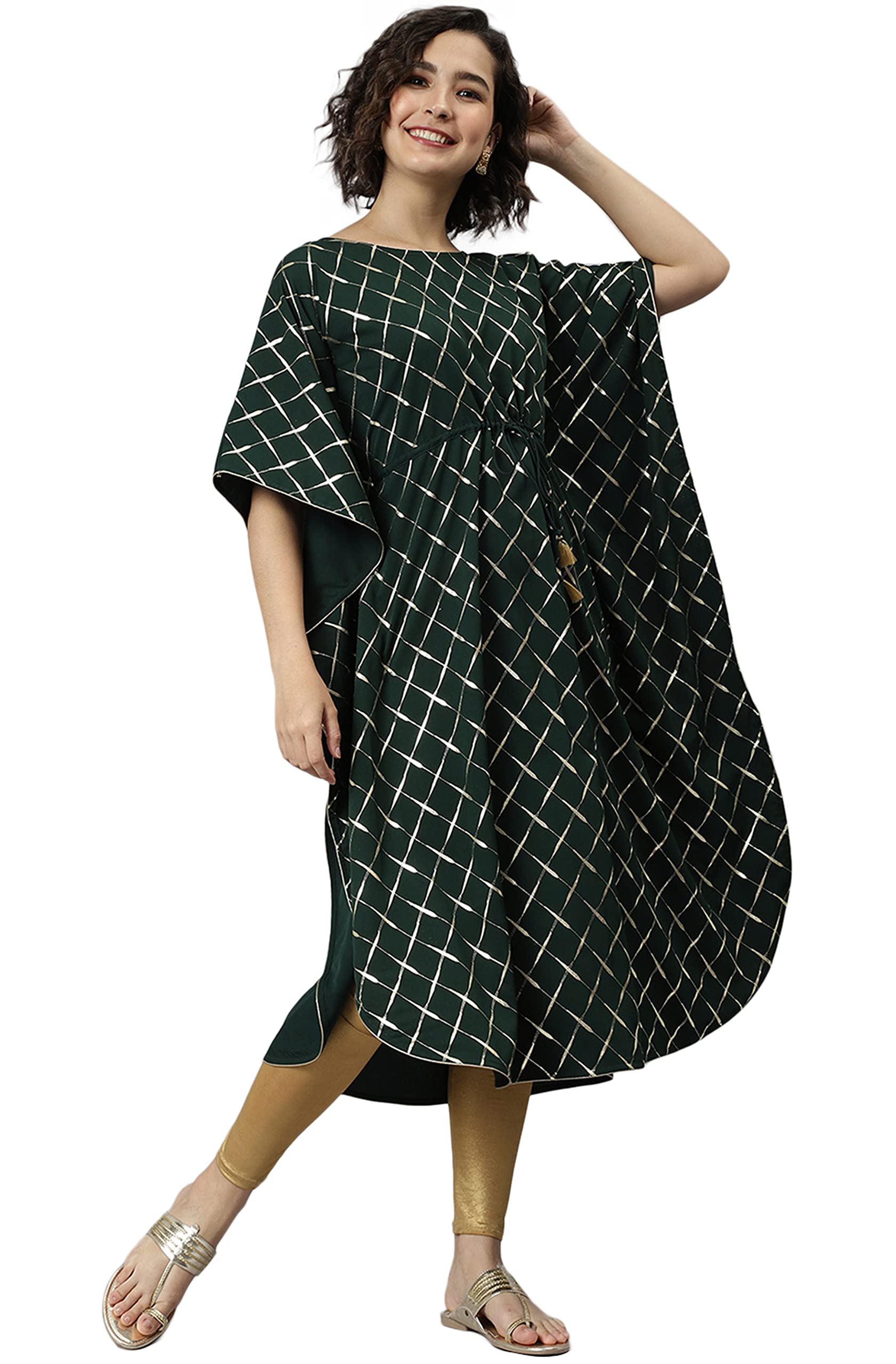 Green poly crepe kaftan with stylish checkered design.
